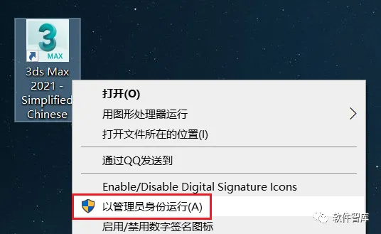 14.找到上一步生成的3dMax2021图标,鼠标右击选择【以管理员身份运行】