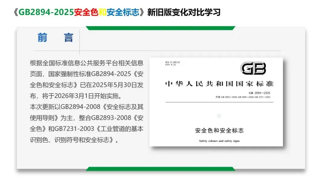 强制性国家标准GB 2894-2025《安全色和安全标志》发布,该标准将于2026年3月1日正式实施。这一新标准将全面替代已经实施多年的GB 2893-2008《安全色》、GB 2894-2008《安全标志及其使用导则》和GB 7231-2003《工业管道的基本识别色、识别符号和安全标识》三项标准,实现了对安全标志相关规范的全面整合与升级。其中很多安全标志样式发生了改动,请及时辨识, 替换成为最新版本,做好过渡期管理,否则可能会被处罚!2026年3月1日起,所有安全标志应符合GB 2894-2025《安全色和安全标志》规定。