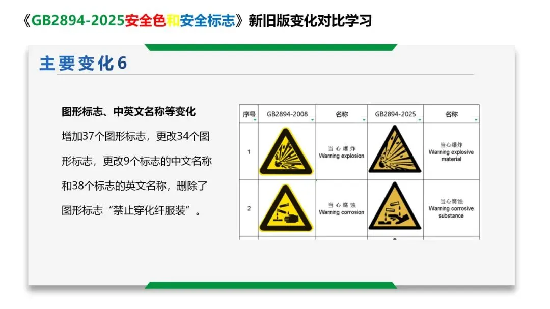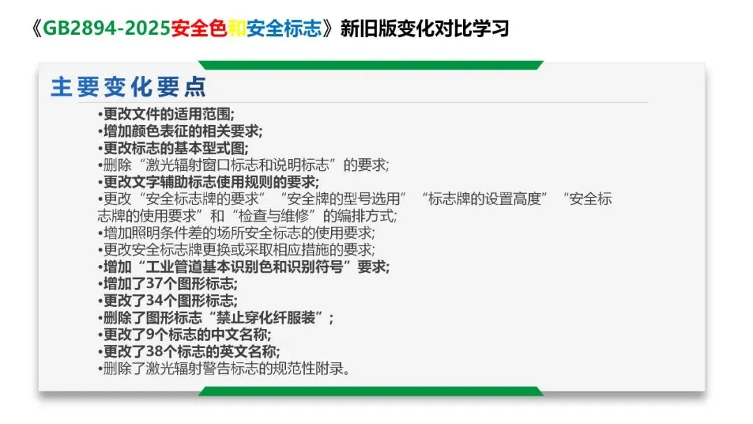标准代替了GB 2893-2008《安全色》, GB 2894-2008《安 全标志及其使用导则》和GB 7231-2003《工业管道的基本识别色、识别符号和安全标识》。与GB 2893-2008、GB 2894-2008和GB 7231-2003相比,除结构调整和编辑性改动外,主要技术变化如下: