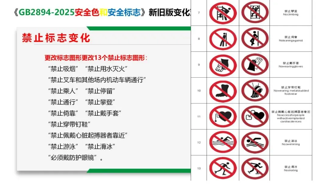 4) 更改了34个图形符号:禁止吸烟,禁止烟火,禁止用水 灭火,禁止堆放,禁止叉车和厂内机动车辆通行,禁止乘人,禁止 通行,禁止攀登,禁止倚靠,禁止饮用,禁止戴手套,禁止穿带钉 鞋,禁止佩戴心脏起搏器者靠近,禁止游泳,当心腐蚀,当心中毒, 当心感染,当心落物,当心挤压,当心夹手,当心叉车,必须戴防 护眼睛,必须戴防尘口罩,必须戴防毒面具,必须戴护耳器,必须 戴安全帽,必须系安全带,必须穿防护服,必须戴防护手套,必须 8 洗手,必须加锁,紧急出口,紧急集合点,击碎板面;