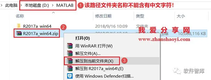 1.先使用“百度网盘客户端”下载Matlab 2017a软件安装包到电脑磁盘里根目录或全英文路径的文件夹下,如小编这里下载到D盘MATLAB文件夹里,然后鼠标右击选择【解压到当前文件夹下】