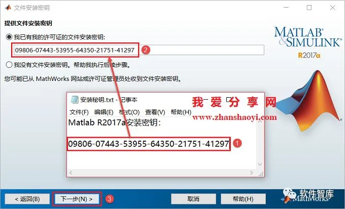 6.返回软件安装包,双击打开“安装密钥.txt”,然后将安装密钥复制粘贴到安装界面中,Matlab 2017a安装密钥:09806-07443-53955-64350-21751-41297,然后点击【下一步】