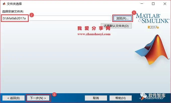 7.选择软件安装文件夹,默认安装在C盘,因软件占用磁盘空间10G+,建议点击【浏览】更改软件安装位置,注意:安装路径文件夹名称均不能含有中文字符!如小编这里将软件安装在D盘Matlab2017a文件夹下,设置好后点击【下一步】