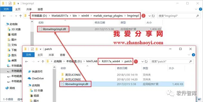 13.返回初始软件安装目录,双击打开patch文件夹,然后将libmwlmgrimpl.dll文件复制到安装目录中lmgrimpl文件夹里,例如小编的安装目录是D:\Matlab2017a,所以复制粘贴到D:\Matlab2017a\bin\win64\matlab_startup_plugins\lmgrimpl\文件夹下