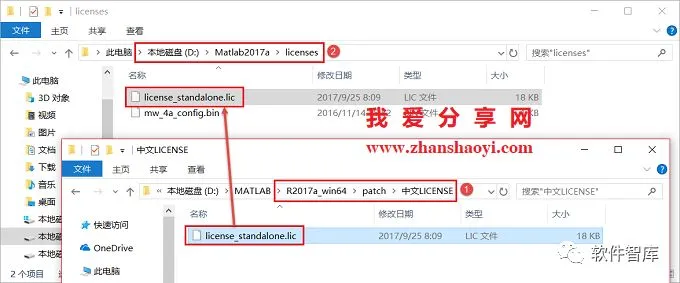 15.打开patch文件夹内的中文LICENSE文件夹,将文件夹里面的license_standalone.lic文件复制并粘贴到安装目录中licenses文件夹里,如小编的安装目录是D:\Matlab2017a,所以复制粘贴到D:\Matlab2017a\licenses\文件夹下。注意:如果希望安装英文版的Matlab 2017a,复制粘贴patch文件夹下的英文LICENSE中的license_R2017a.lic即可