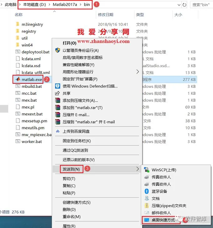 16.破解完成,打开安装目录中的bin文件夹,然后matlab.exe,鼠标右击选择【发送到】→【桌面快捷方式】生成桌面快捷方式,方便以后打开,注意:本站提供的Matalb 2017a软件不自动生成桌面快捷方式
