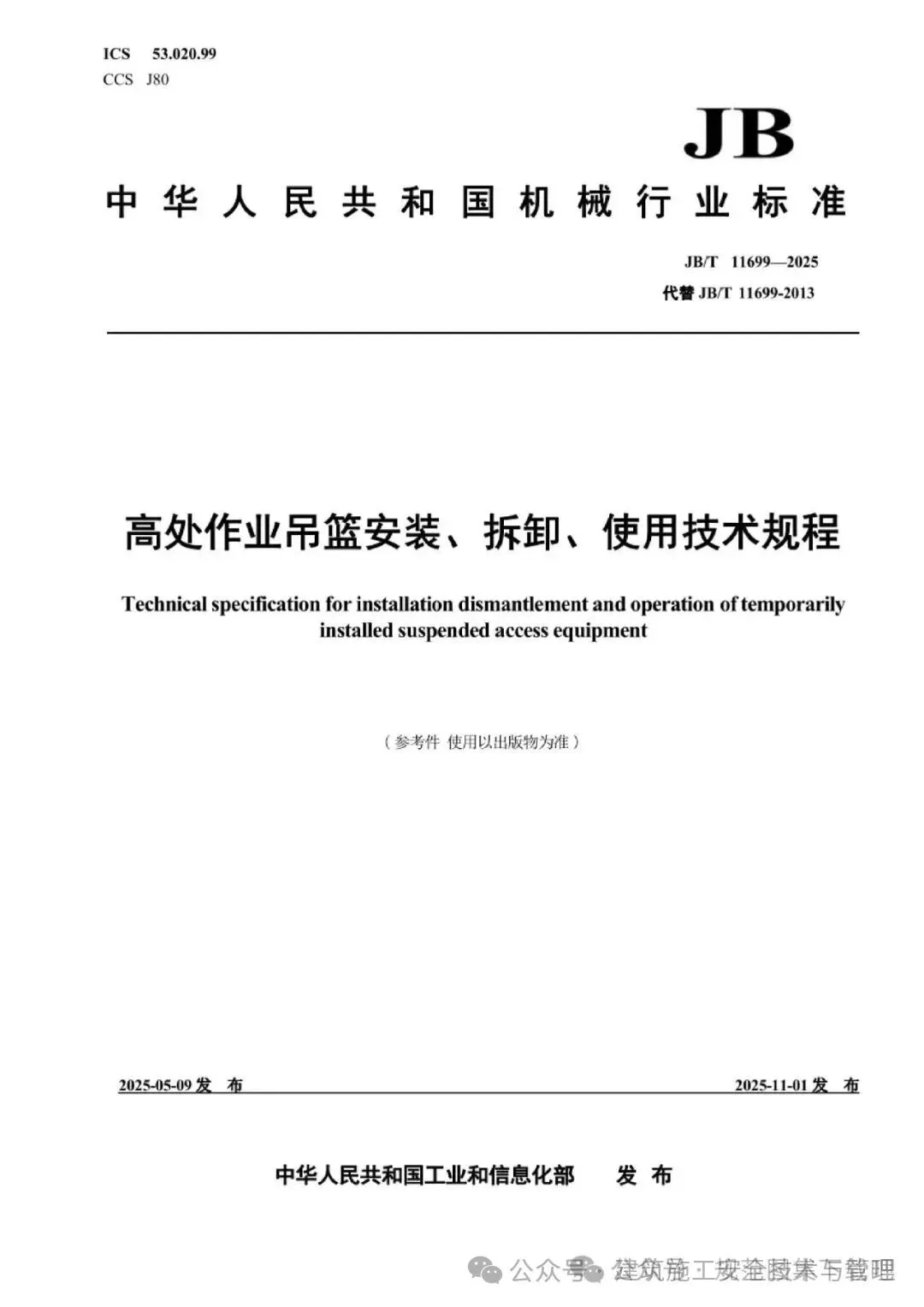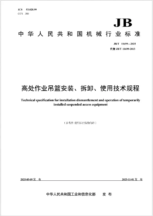 JB/T 11699-2025《高处作业吊篮安装、拆卸、使用技术规程》是一项至关重要的机械行业标准,它已于2025年11月1日正式实施,全面替代了之前的2013年版本。