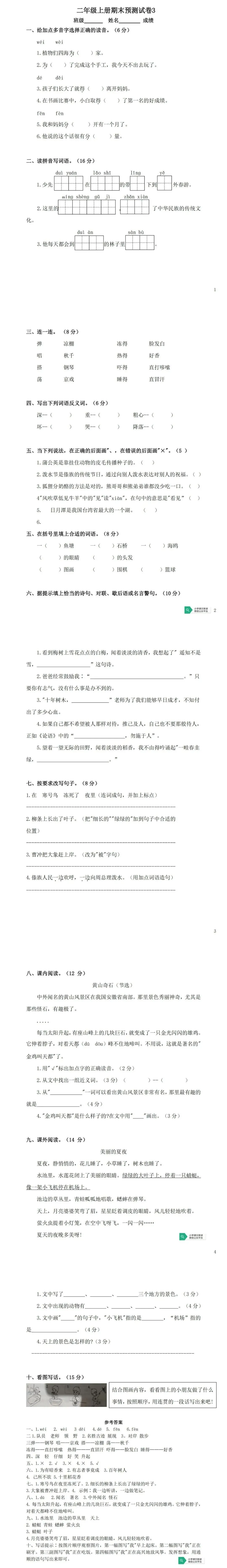 二年级上册期末预测试卷3(免费下载)