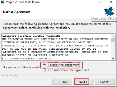 5. 接受软件许可协议,勾选【I accept the agreement】,然后点击【Next】。