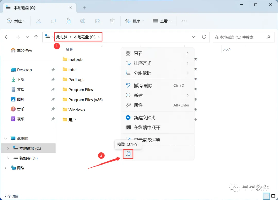12、打开本地C盘,再右键文件夹的空白处,点击【粘贴按钮】