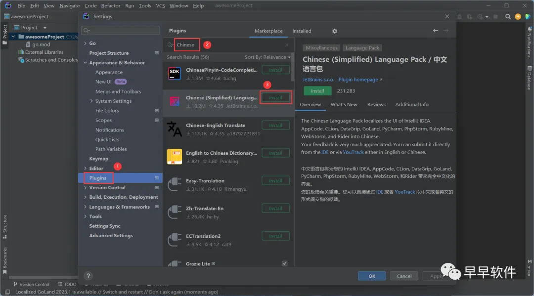 30、点击【Plugins】,在搜索框输入【Chinese】,找到【Chinese(Simplified)…】程序,再点击【Install】