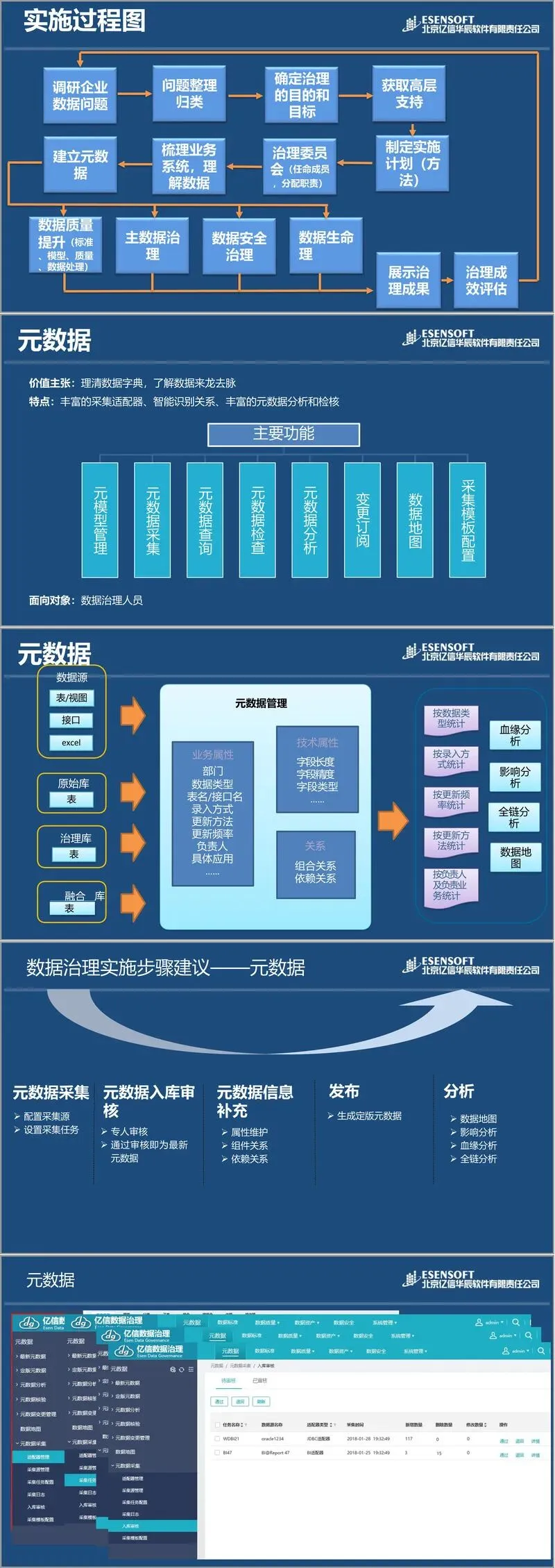 方案的实施并非纯技术活动,而是强调组织、制度、流程与技术的协同。亿信华辰设计了清晰的治理角色与流程,从数据治理决策委员会到各业务系统接口人,明确了各方职责,确保治理工作有效落地。实施过程建议从元数据采集入手,逐步扩展到标准制定、质量提升等环节。
