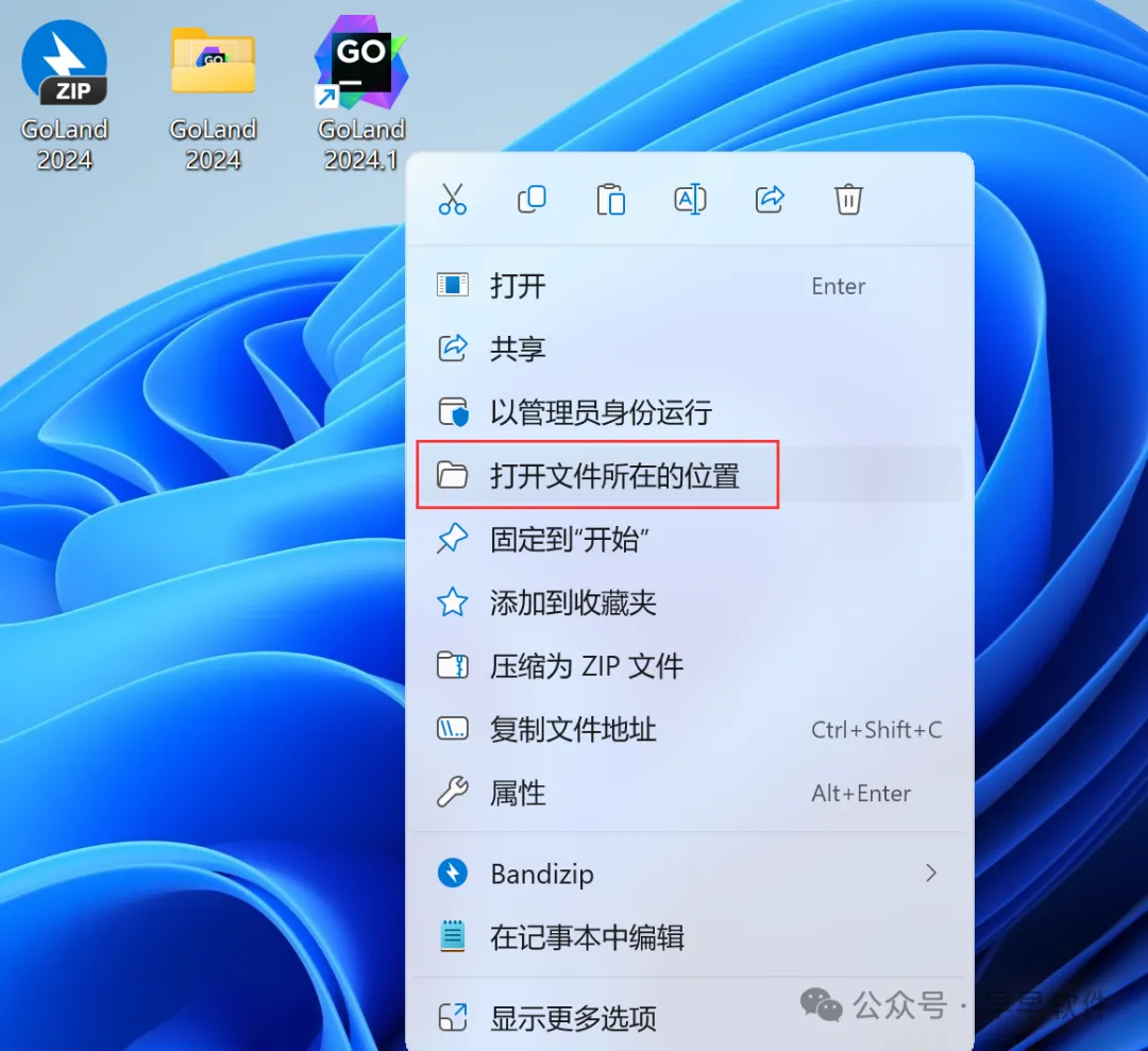 11、回到桌面,右键桌面上的【GoLand 2024.1软件图标】,点击【打开文件所在的位置】