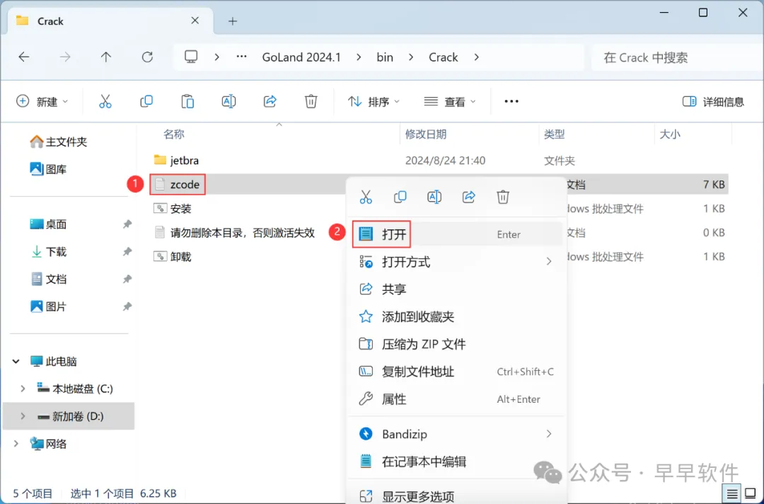 21、回到Crack文件夹,找到【zcode】文档,右键【打开】它