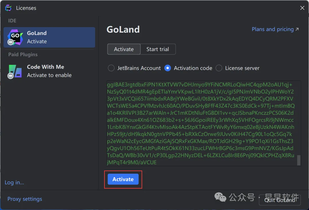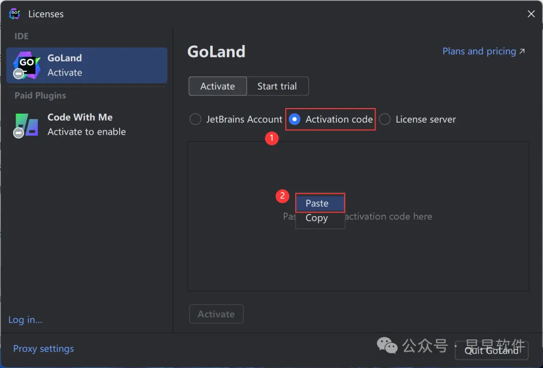 23、回到GoLand 2024软件界面,点击【Activation code】,再右键的空白处,点击【Paste】