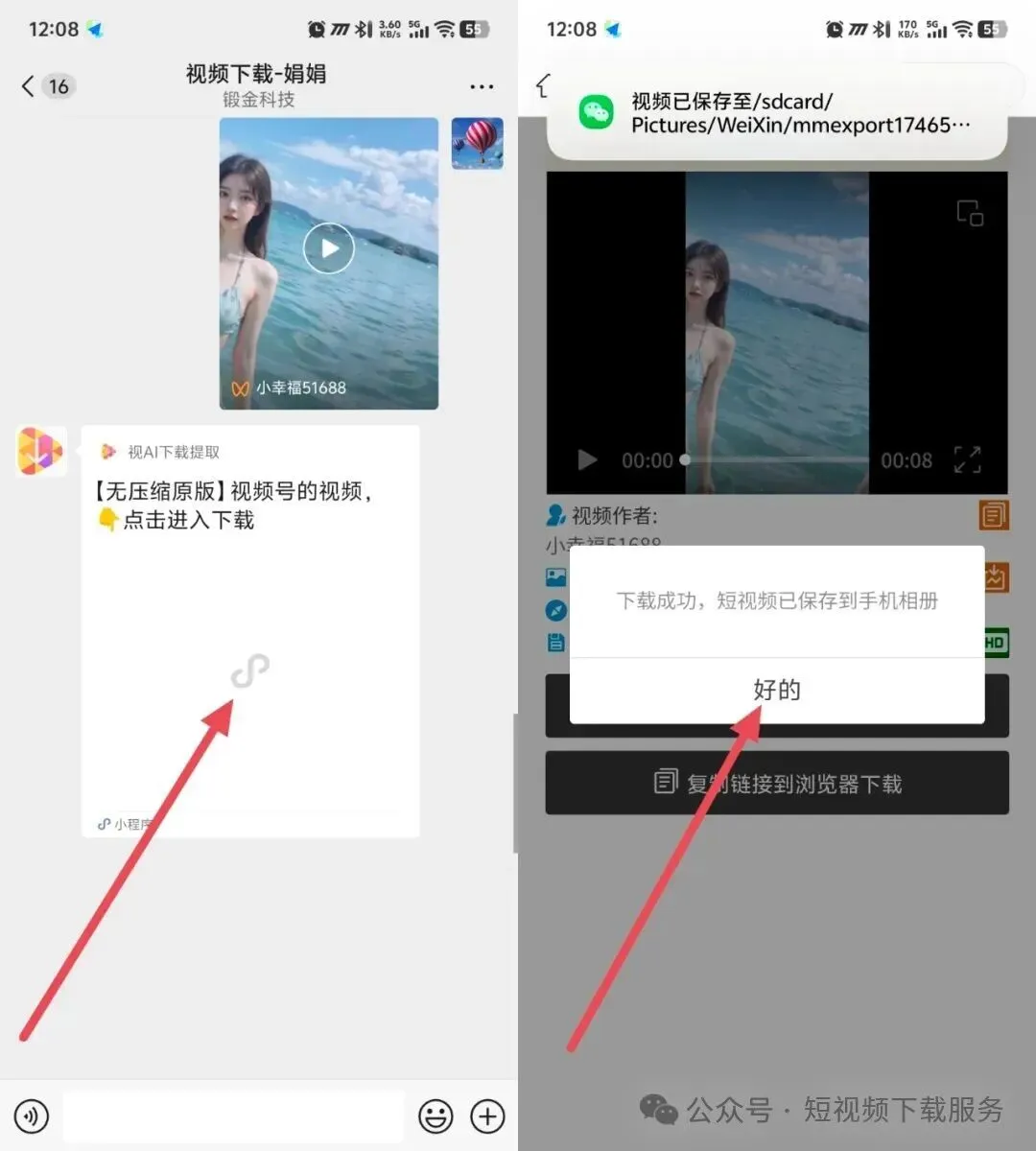 3️⃣ 一键下载,保存到本地! 👉 机器人会自动解析视频,并返回一个下载小程序链接。进入小程序,轻轻一点,就能将视频保存到你的手机相册啦!