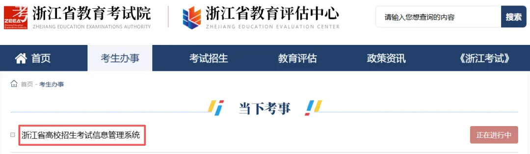 电脑上打开浏览器,输入“浙江省教育考试院”网址“www.zjzs.net”,进入如下页面,点击“考生办事”,再点一下"浙江省高校招生考试信息管理系统"。