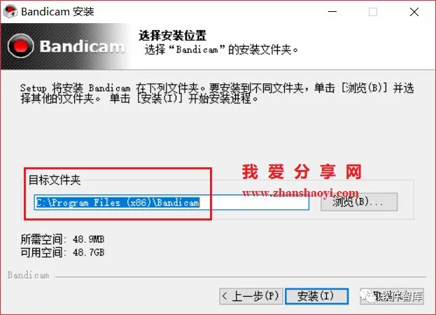 6.选择软件安装路径,默认安装在C盘,点击【浏览】可更改软件安装路径,注意:该路径文件夹名称均不能含有中文字符!小编这里将软件安装在D盘Bandicam文件夹下,然点击【安装】