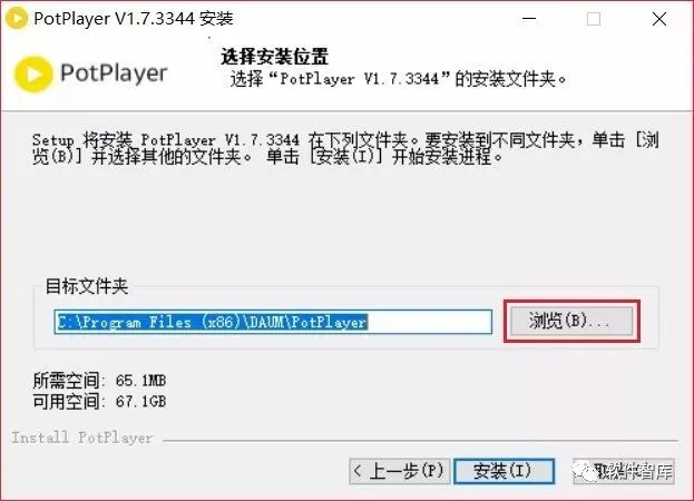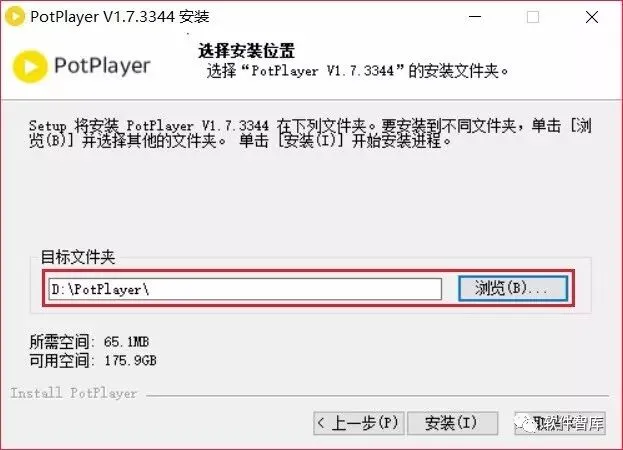 6.选择软件安装位置,默认安装在C盘,可点击【浏览】将软件安装到其他盘内,小编这里安装在D盘PotPlayer文件夹下,然后点击【安装】