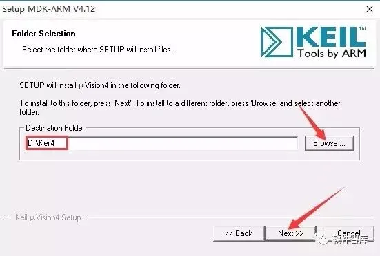 4.选择软件安装路径,默认安装在C盘,点击【Browse】可更改安装路径,注意:安装路径文件夹名称均不能出现中文字符!小编这里将软件安装在D盘Keil4文件夹内,然后点击【Next】