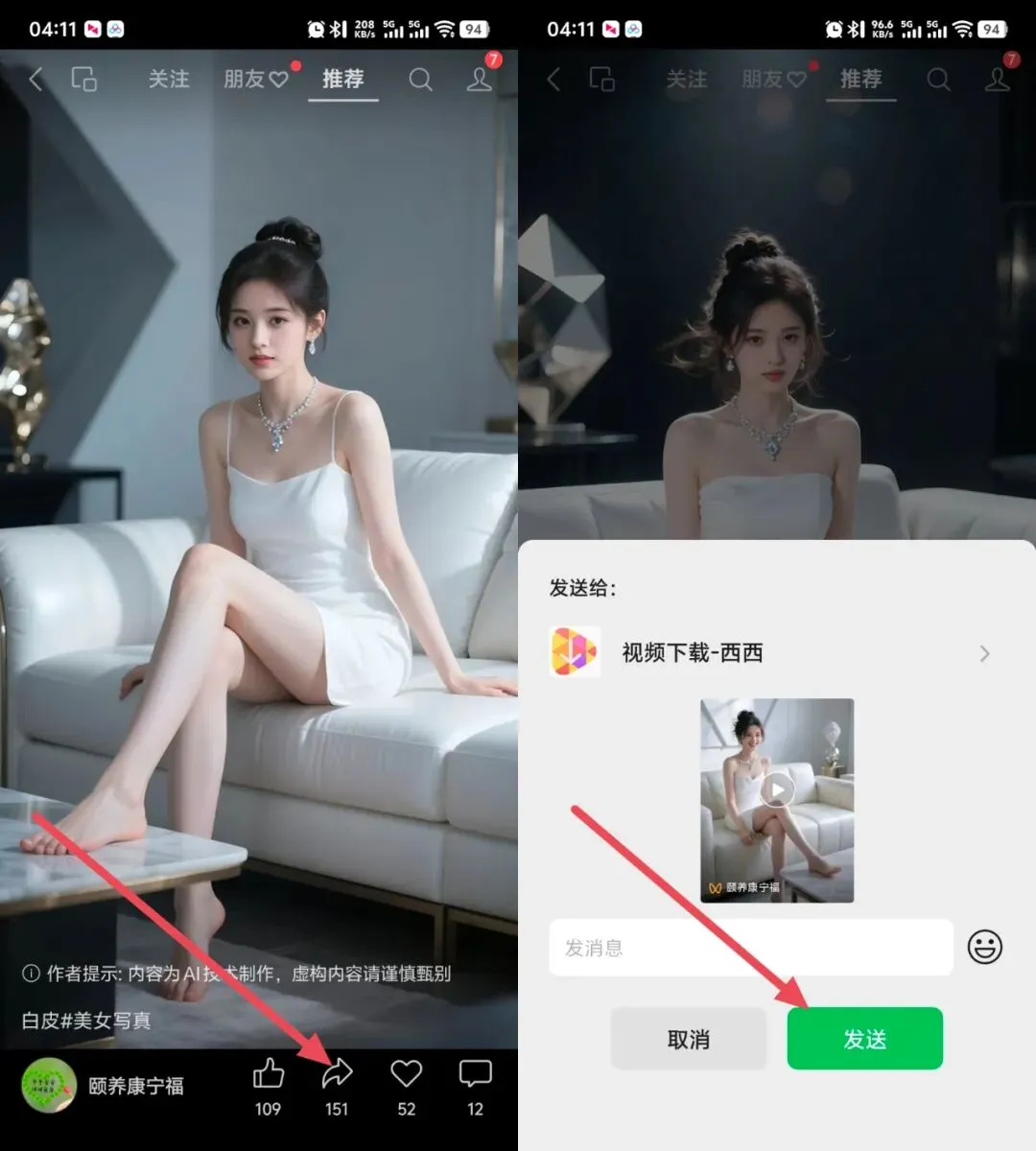 ① ➡️ 进入视频号,找到你喜欢的视频,点击“转发”按钮;选择“转发给朋友”,发送给视频下载机器人。