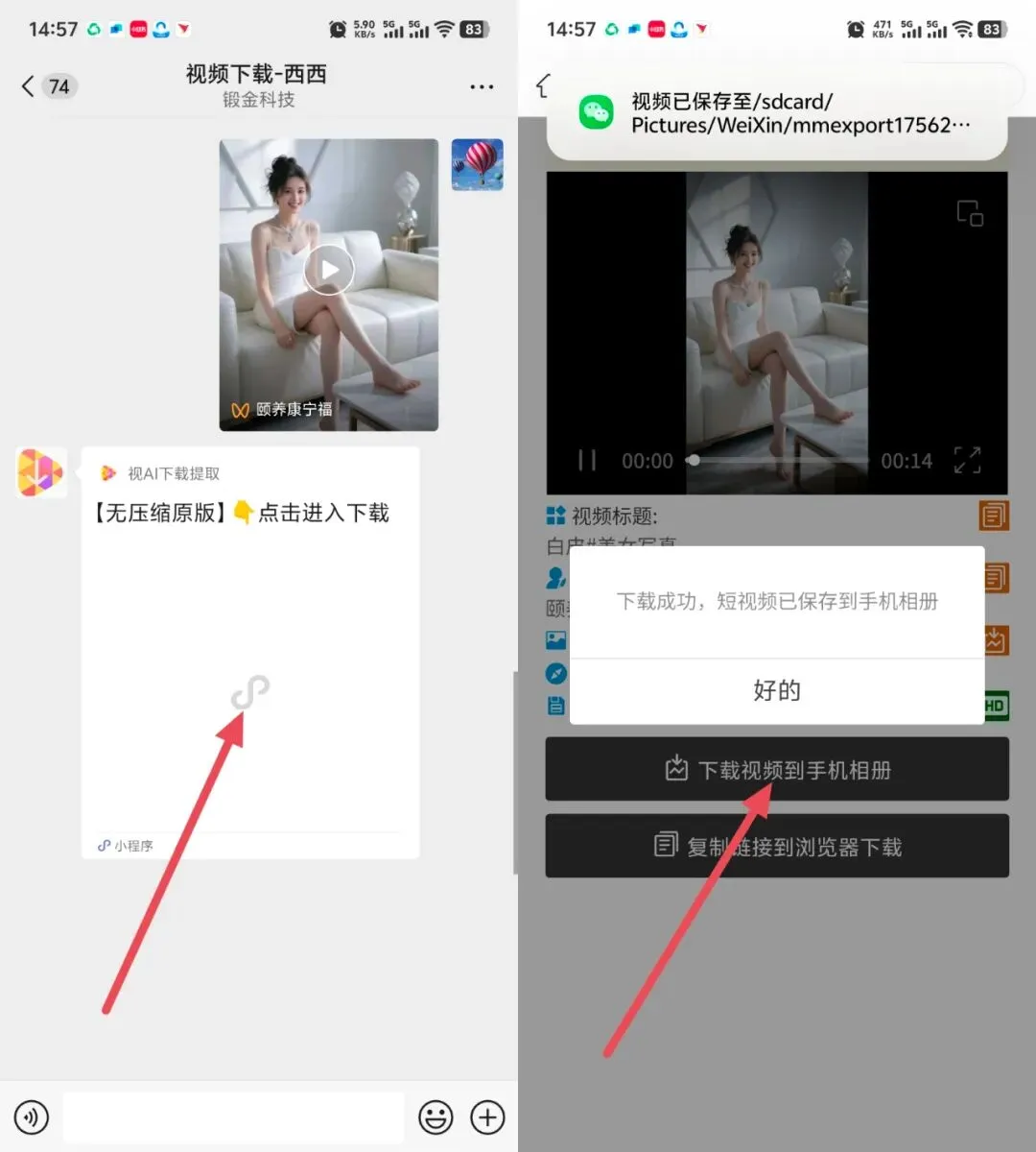 ② ➡️ 视频下载机器人会自动解析并返回下载小程序链接;进入小程序,即可一键下载到手机相册!是不是超简单?