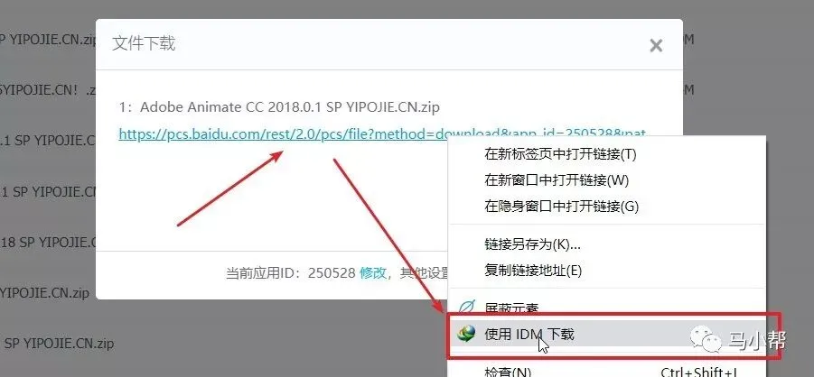 点击"生成链接"按钮,会弹出文件下载的窗口。右键下载链接,选择使用IDM下载。即可自动调用idm并开始下载。