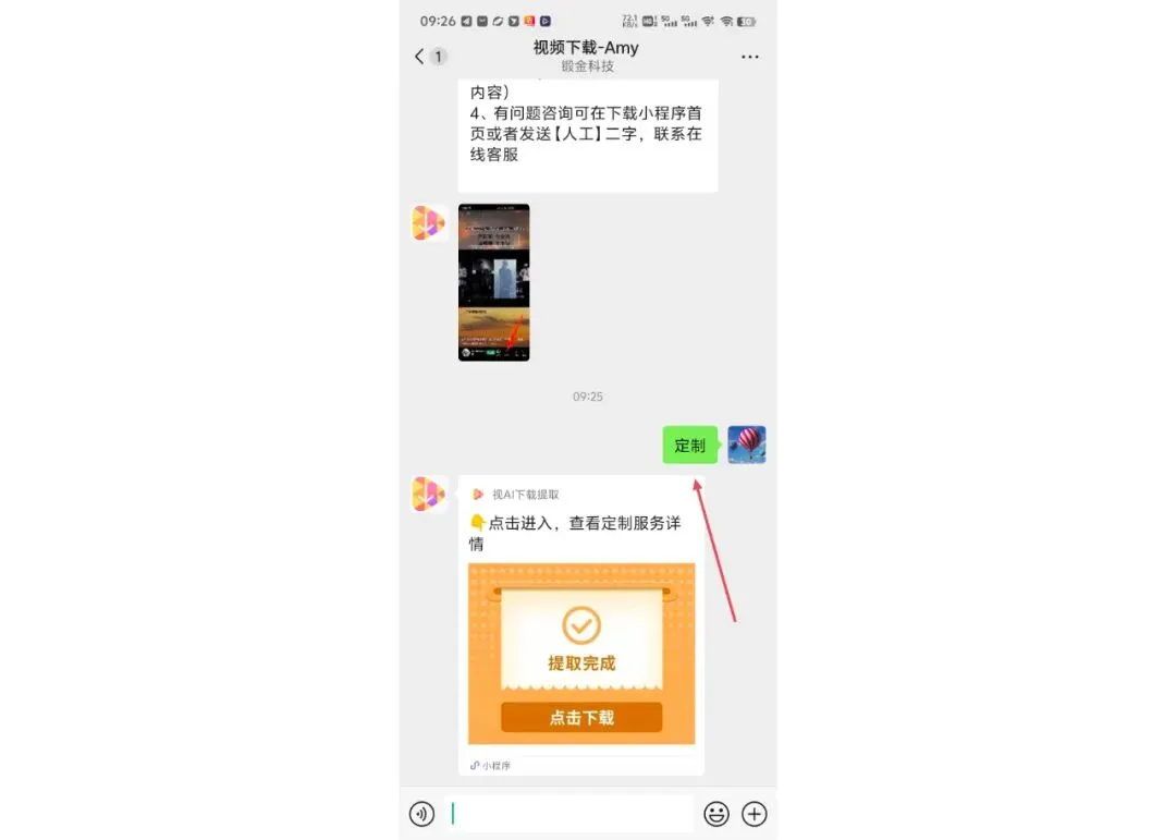 3️⃣ 视频下载客服机器人会自动解析并返回下载小程序 → 进入小程序,一键下载到手机相册!