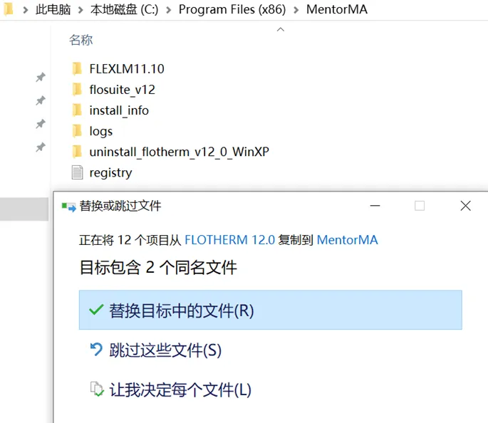 复制flosuite_v12文件夹,粘贴到安装目录下的MentorMA文件夹中,在弹出的对话框中选择“替换目标中的文件”。