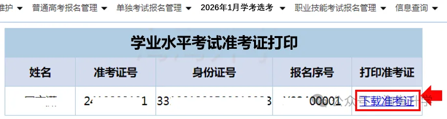 点击上图红色框内文字“浙江省高校招生考试信息管理系统”,或者直接输入网址https://pgzy.zjzs.net:4431/login.htm进入账号登录页面:请使用360安全浏览器(兼容模式)、谷歌浏览器等,不要使用手机和平板电脑。在上图所示区域输入考生的身份证号码和密码(密码只有考生和家长自己知道),输入验证码,点击登录,进入下图所示页面:点击“下载准考证”,出现准考证的pdf文档,考生可以下载文档到有打印机的地方打印,有打印机的,直接点击打印即可。(样图根据2025年1月的准考证制作,真实式样以实际为准)准考证用A4纸打印,纸张太大,使用的时候,建议对折,方便考试时放置于桌上。把考场安排信息置于上方,《考生须知》置于下面。特别提醒:正反两面在使用前及使用期间不得涂改或者书写任何文字。拿到准考证后,考生务必认真阅读准考证上的《考生须知》,特别重视以下要求:1. 考生凭准考证、身份证进入指定考场,对号入座,入座后将准考证、身份证放在桌面左上角。