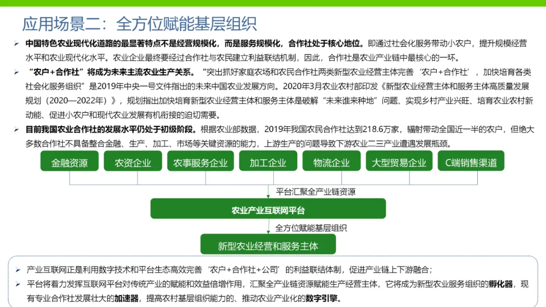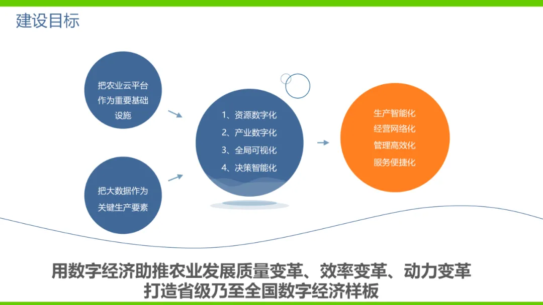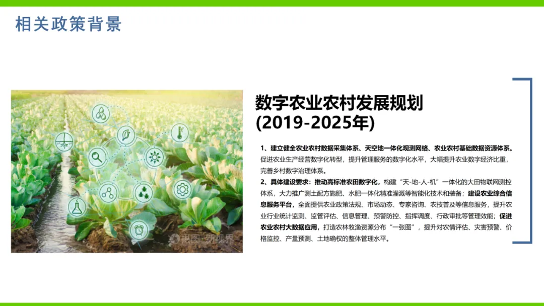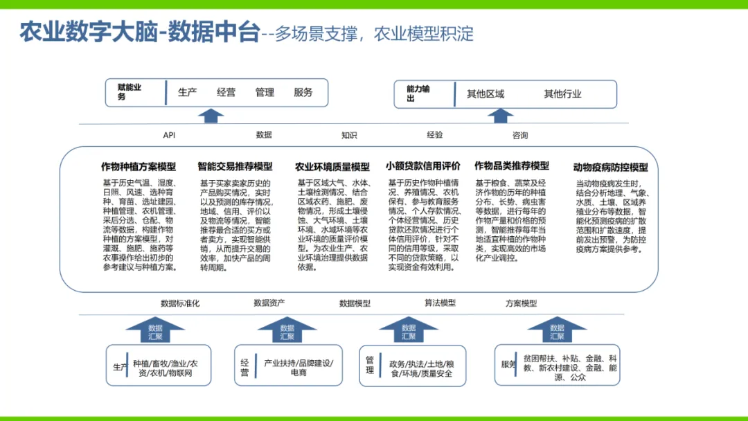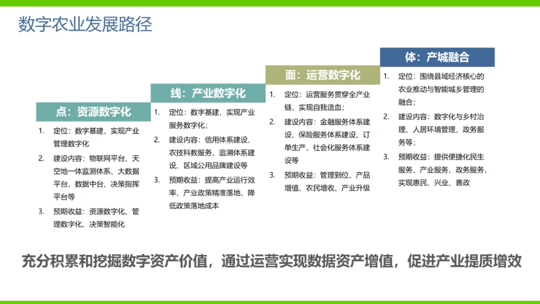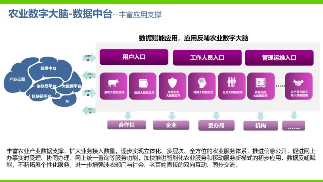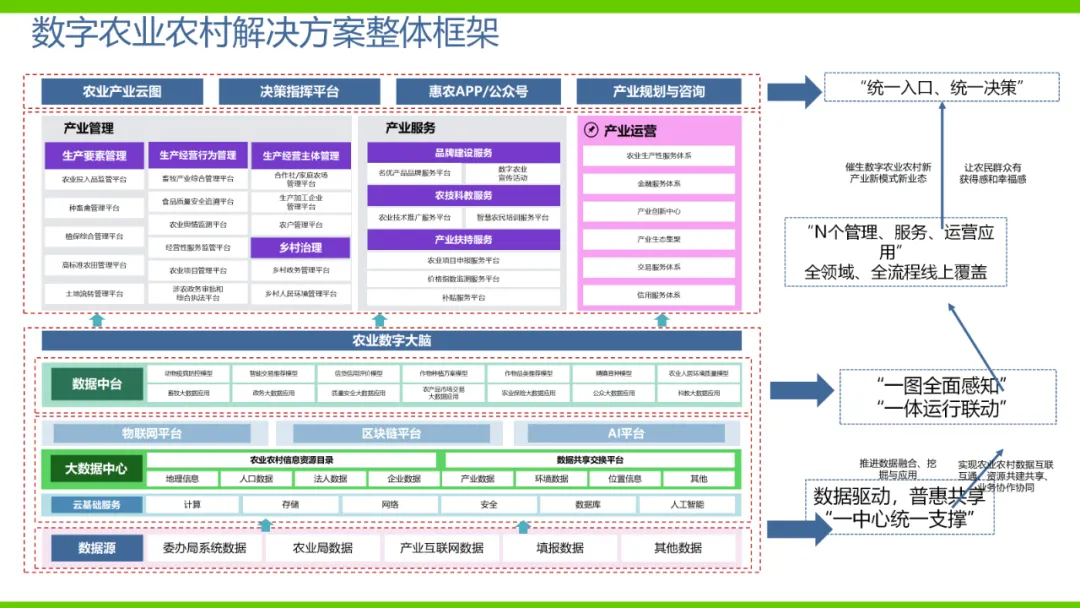 本方案旨在通过数字化手段推动农业产业转型升级,解决当前农业产业化程度低、附加值低及数据资源分散等问题。方案依托国家政策背景,如“上云用数赋智”行动及乡村振兴战略,构建农业云平台作为核心基础设施,实现资源数字化、产业数字化、全局可视化及决策智能化。方案亮点在于打造农业产业互联网平台,聚合全产业链资源,通过金融、农资、订单等环节的运营服务,促进农业降本增效和产业升级。同时,利用大数据、区块链等技术提升农业管理数字化水平,完善乡村数字治理体系。通过天空地一体化观测网络及农业农村基础数据资源体系建设,推动农业生产经营数字化转型。此外,方案还注重产业服务数字化,如信用体系建设、农技科教服务及追溯体系建设等,提高产业运行效率,降低政策落地成本。围绕县域经济核心,推动智能城乡管理与农业产业的深度融合,提供便捷化民生服务、产业服务及政务服务。最终,通过充分积累和挖掘数字资产价值,促进产业提质增效,实现农业可持续发展。