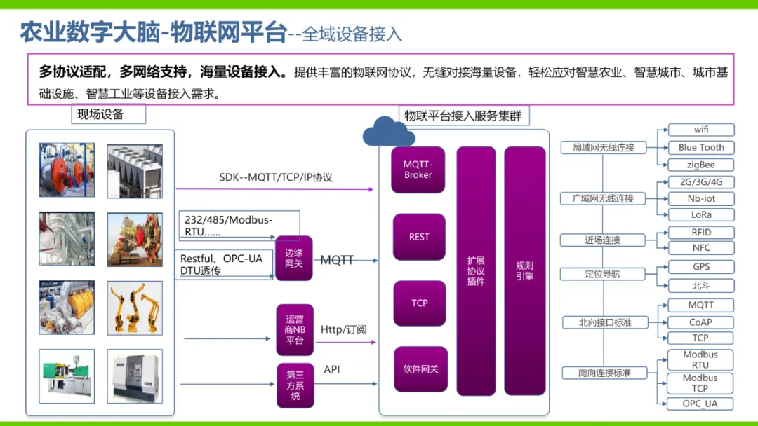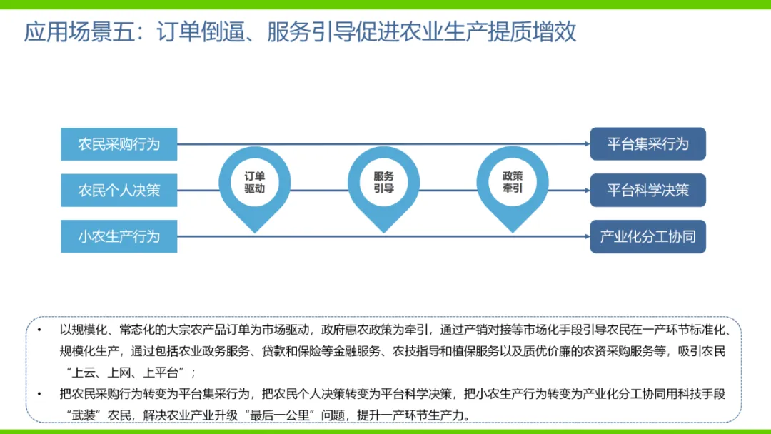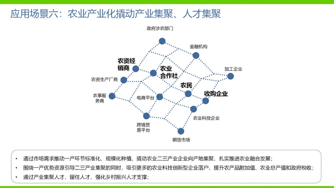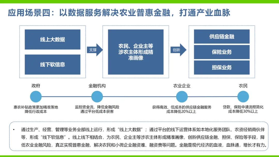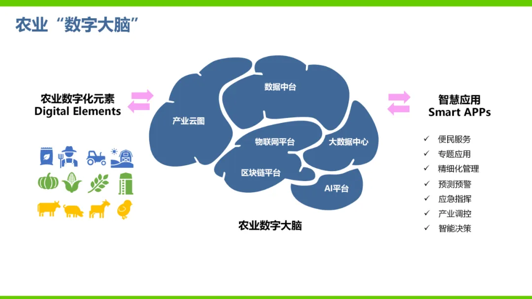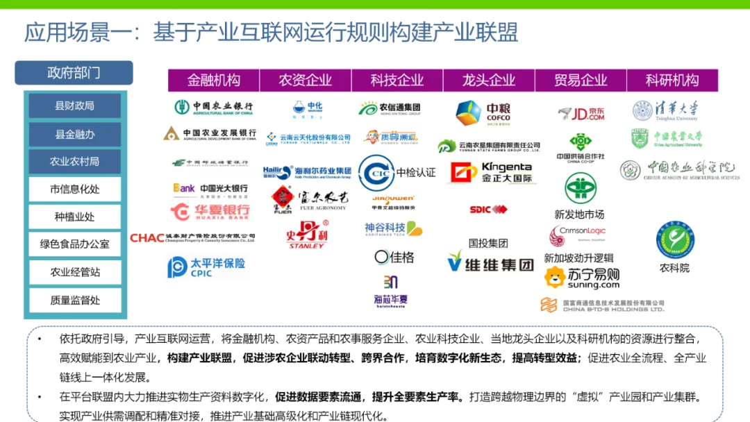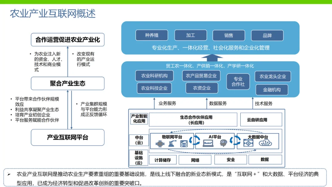 本方案旨在通过数字化手段推动农业产业转型升级,解决当前农业产业化程度低、附加值低及数据资源分散等问题。方案依托国家政策背景,如“上云用数赋智”行动及乡村振兴战略,构建农业云平台作为核心基础设施,实现资源数字化、产业数字化、全局可视化及决策智能化。方案亮点在于打造农业产业互联网平台,聚合全产业链资源,通过金融、农资、订单等环节的运营服务,促进农业降本增效和产业升级。同时,利用大数据、区块链等技术提升农业管理数字化水平,完善乡村数字治理体系。通过天空地一体化观测网络及农业农村基础数据资源体系建设,推动农业生产经营数字化转型。此外,方案还注重产业服务数字化,如信用体系建设、农技科教服务及追溯体系建设等,提高产业运行效率,降低政策落地成本。围绕县域经济核心,推动智能城乡管理与农业产业的深度融合,提供便捷化民生服务、产业服务及政务服务。最终,通过充分积累和挖掘数字资产价值,促进产业提质增效,实现农业可持续发展。
