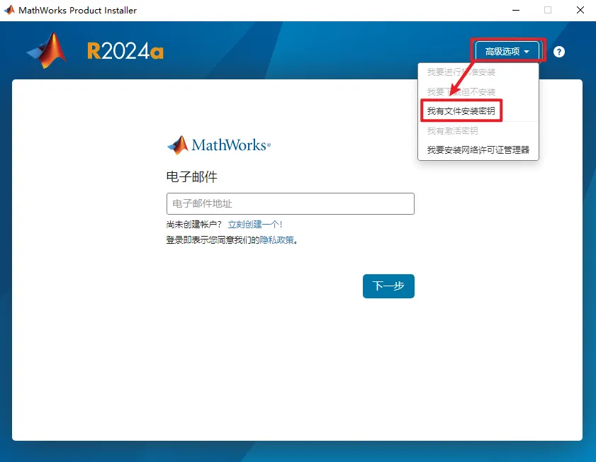 4.点击右上角高级选项,选择我有文件安装密钥。