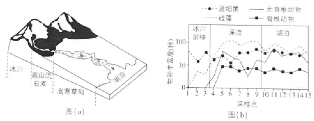 15.冰川融水会将溪流沿岸的无机盐和有机物残体等带入湖泊,如图(a)。环境DNA(eDNA)技术通过检测环境样品中特异性基因序列来识别物种,利用该技术分析青藏高原某冰川前缘、溪流到下游湖泊的15个采样点的物种丰富度,如图(b)。下列叙述正确的是(