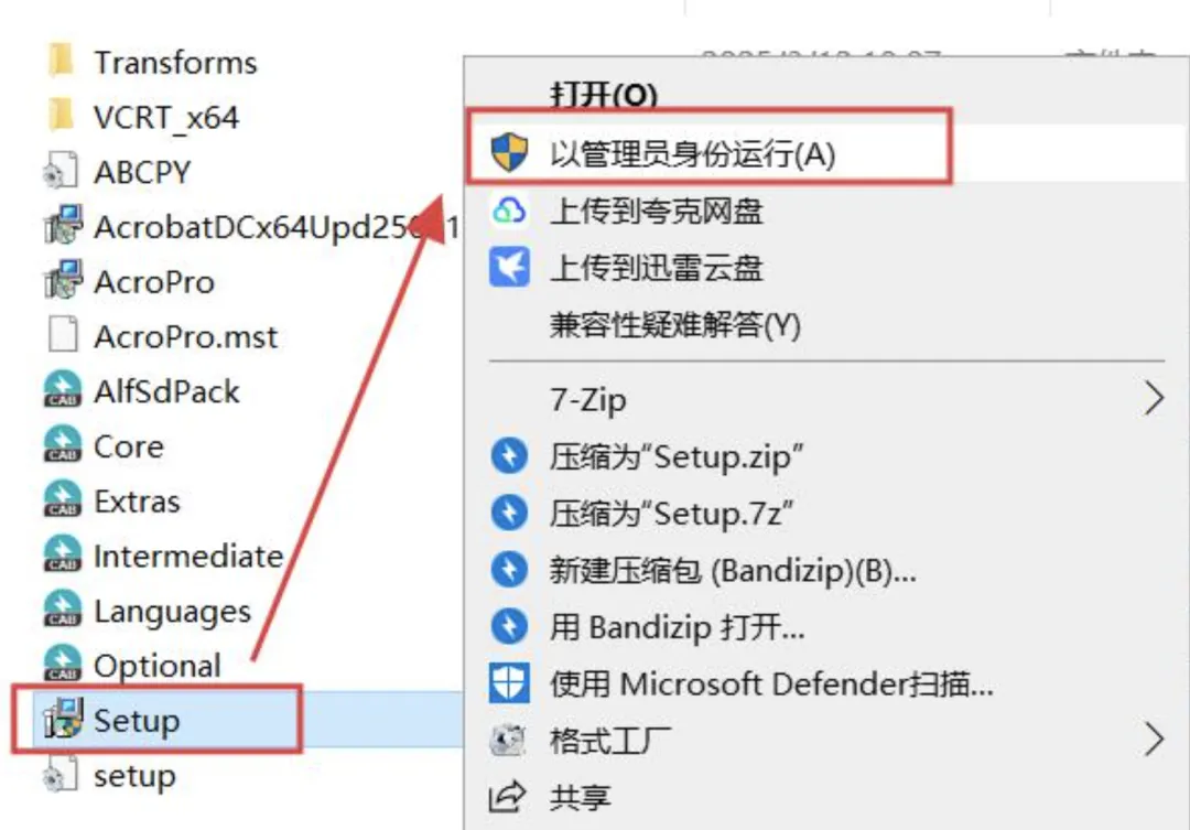 3、运行安装程序: 进入文件夹 Adobe Acrobat Pro,找到 Setup 程序,右键选择:以管理员身份运行。