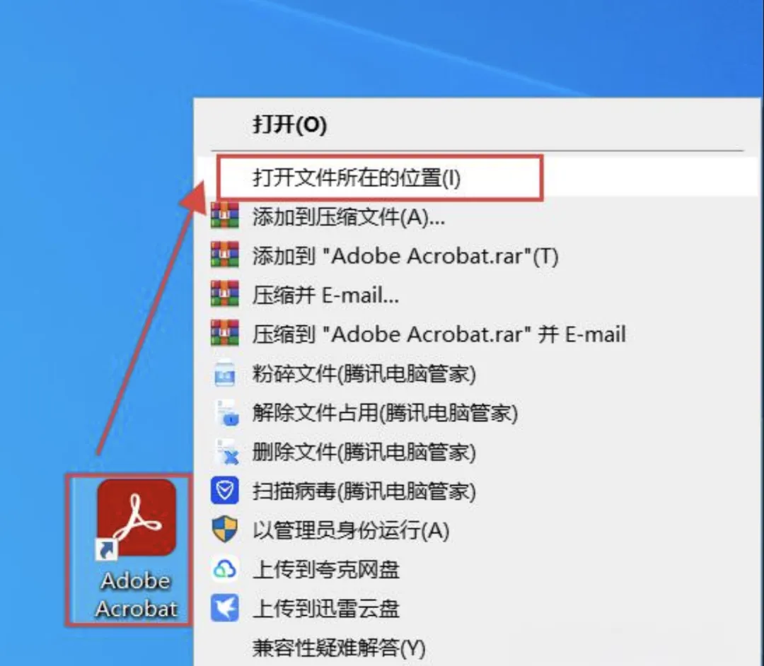 2、打开安装目录: 在桌面找到Acrobat快捷方式,右键点击选择:打开文件所在位置。