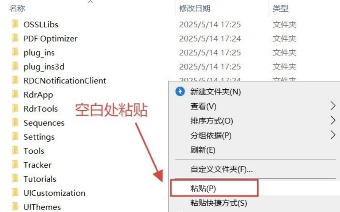 3、粘贴文件: 在打开的目录空白处,右键粘贴复制的文件:crack