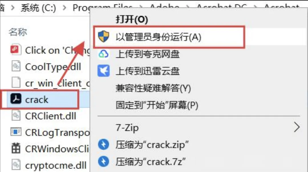 4、运行激活工具: 右键点击粘贴过来的文件:crack,选择:以管理员身份运行。