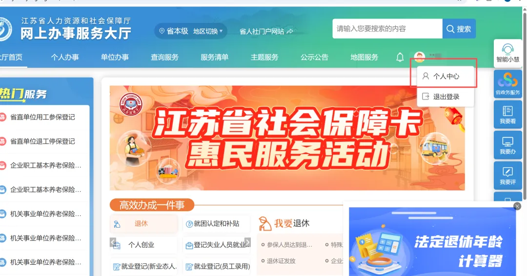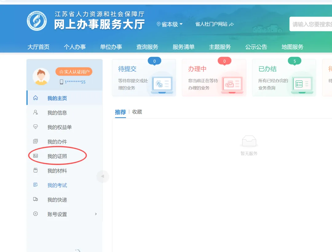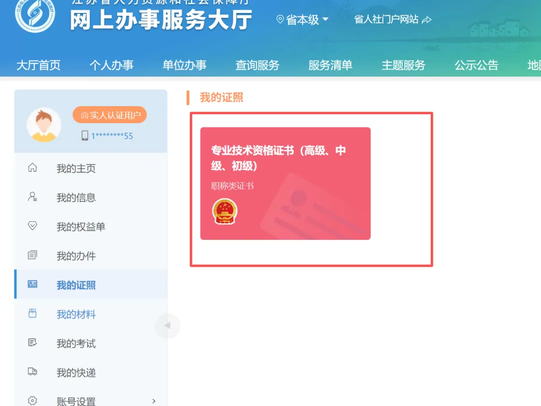 三、 登录‘江苏省人力资源和社会保障厅官网---网上办事服务大厅‘https://rs.jshrss.jiangsu.gov.cn/index/,也可以从江苏省人力资源和社会保障厅官网进入;具体步骤为登录后,点名字,然后点个人中心,然后点我的证照,然后主要啊,可能看不到正高职称证书