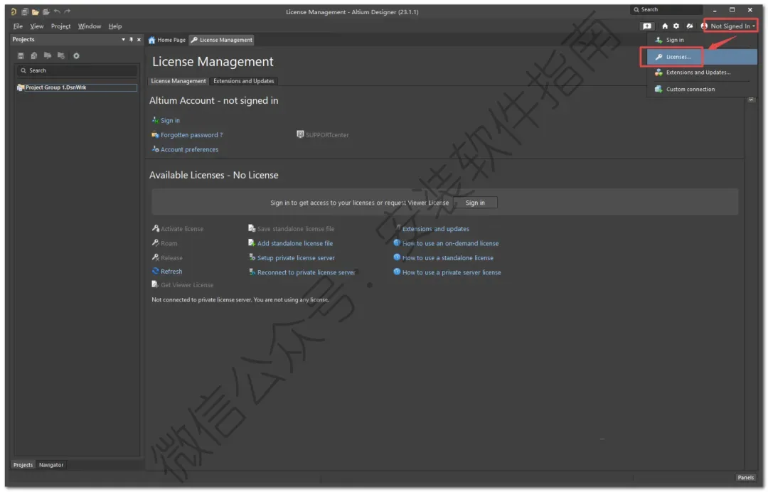 16、点击菜单栏中的“Not Signed In”,选择“Licenses ...”
