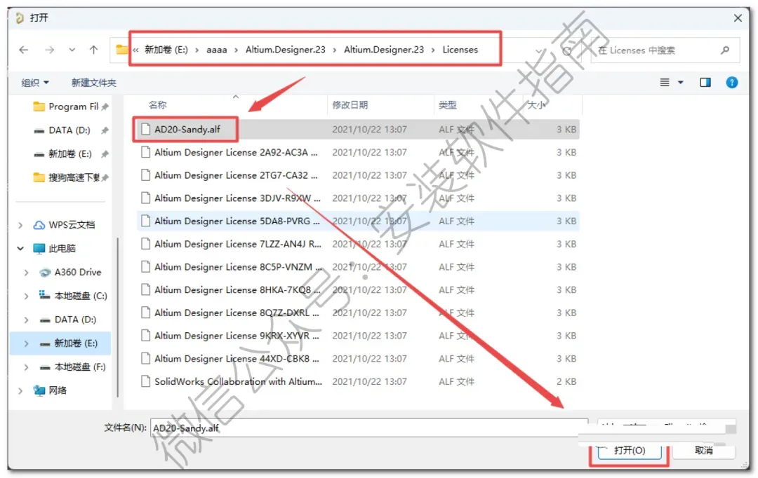 17、找到解压后的“Altium.Designer.23”文件夹路径,打开“licenses”文件夹,选中“AD20-Sandy.alf”文件,点击“打开”