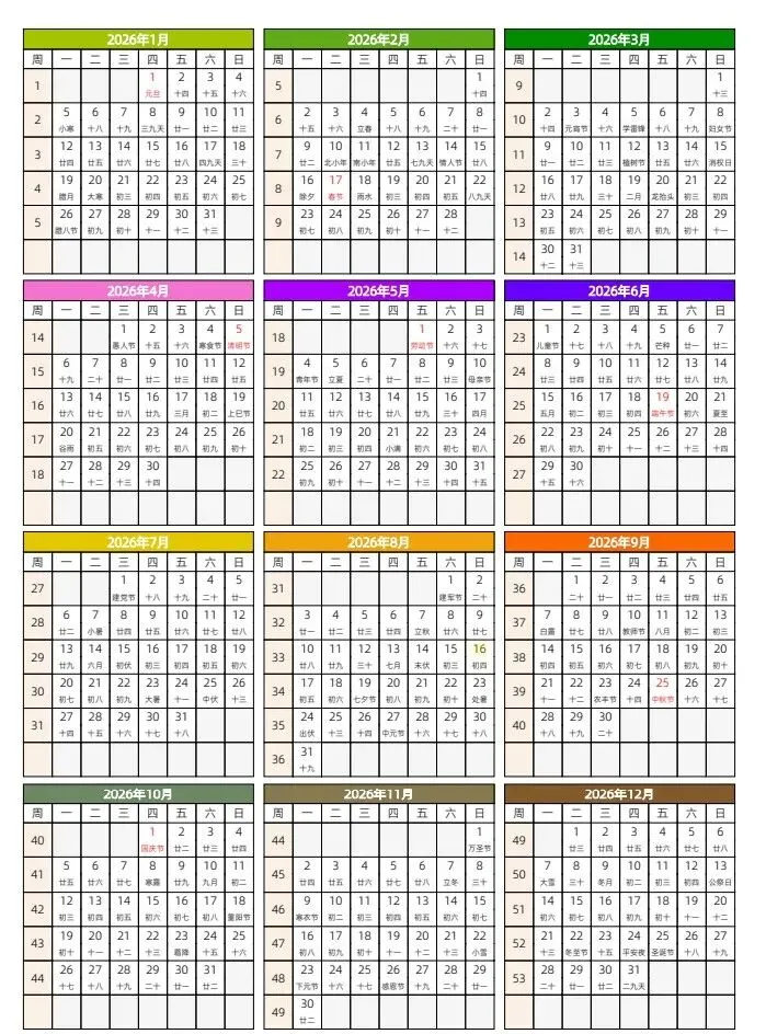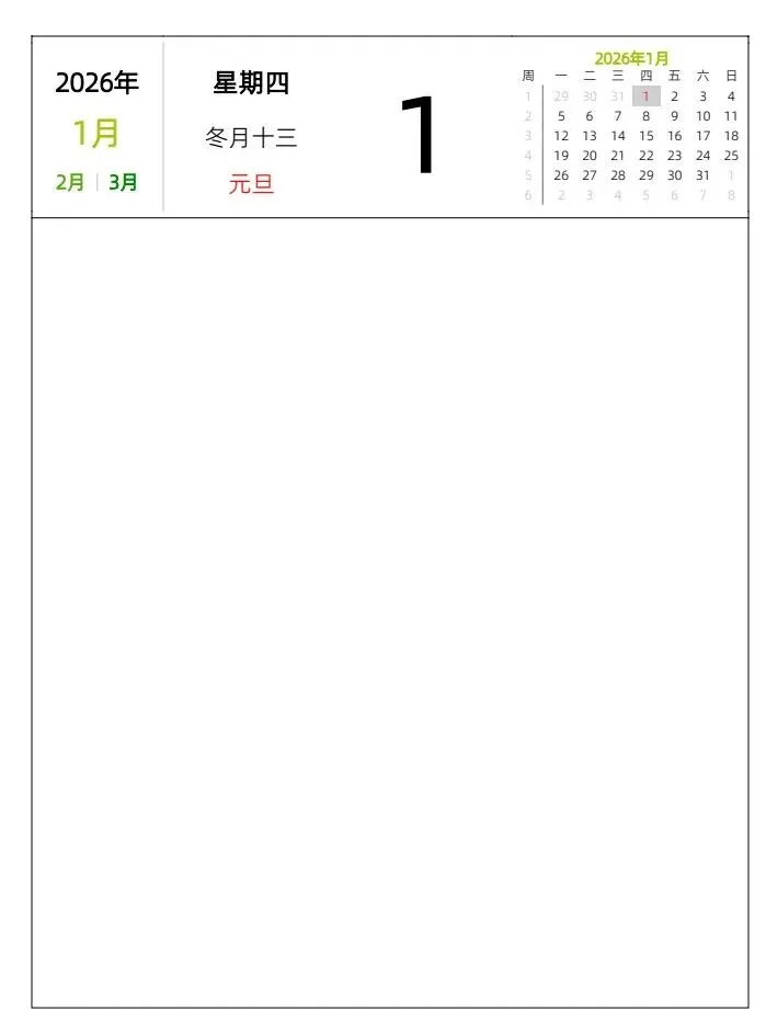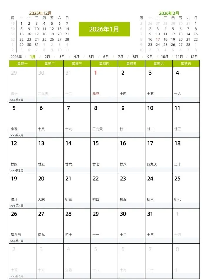 2026高清日历表电子模版日历周历月历年历工作学习计划可下载打印