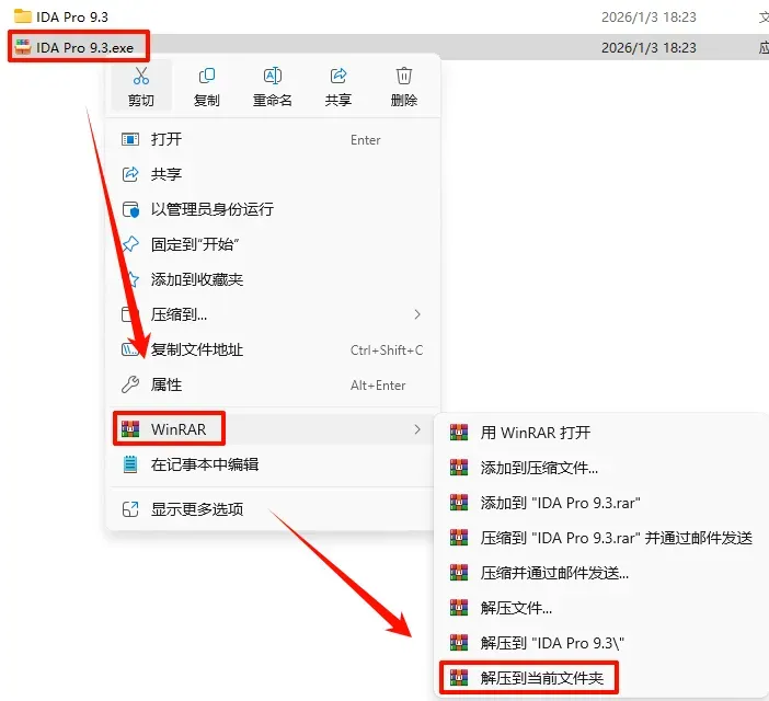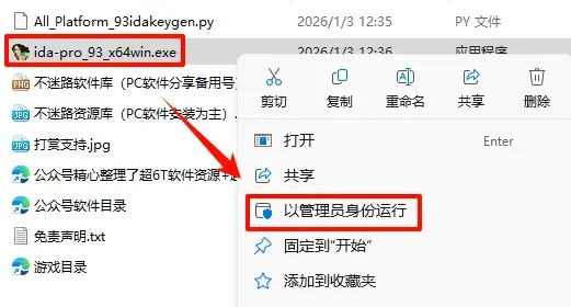 2.打开刚刚解压的文件夹,鼠标右键点击“ida-pro_93_x64win.exe”选择“以管理员身份运行”