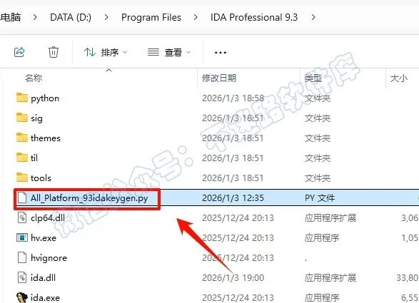 13.返回之前解压的“IDA Pro 9.3”文件夹,选中“All_Platform_93idakeygen.py”文件,鼠标右键点击“复制”
