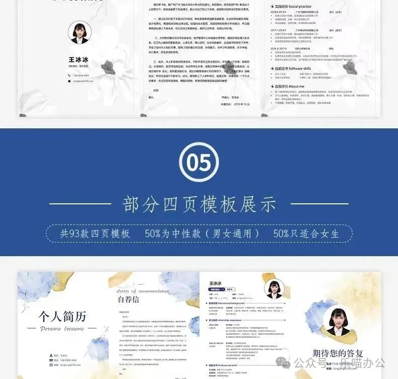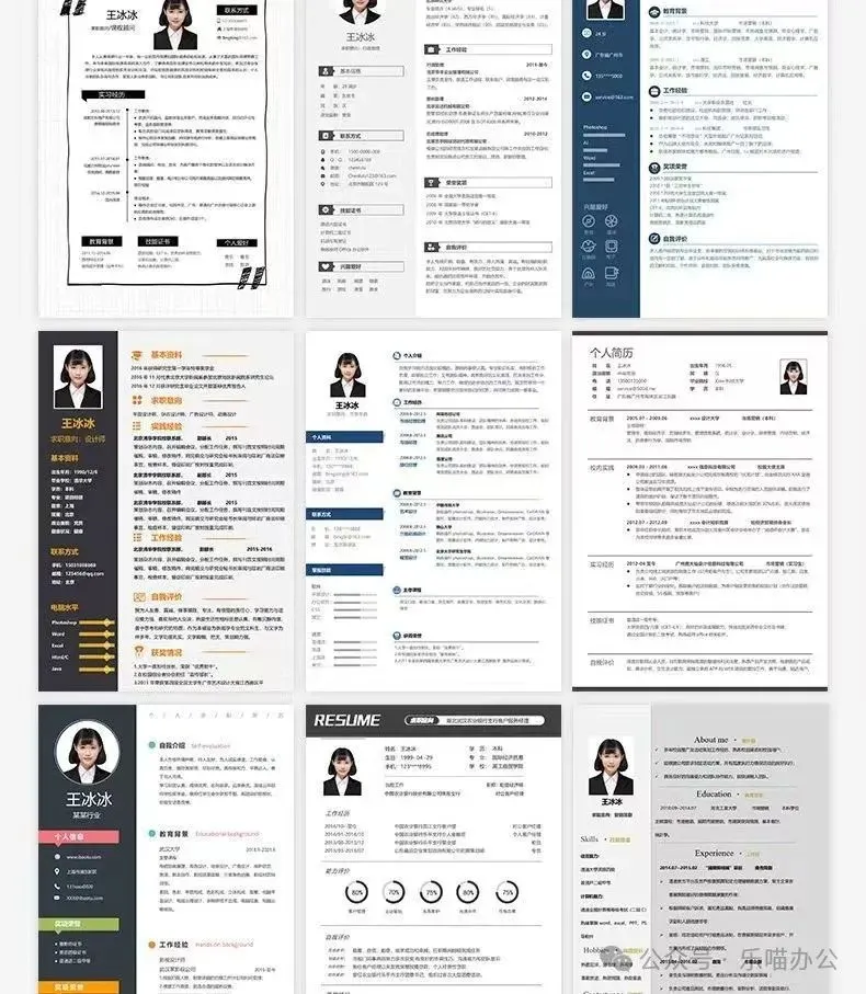 啥风格都有,总有一款适合你,有中文简历,单页简历,自荐信,英文简历,双页简历,封面和表格等多种简历,HR看得贼爽。