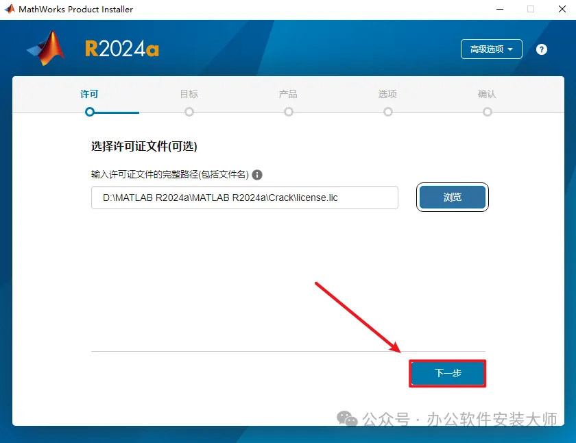 5.点击【浏览】按钮,选择刚才解压出来的【Crack】文件夹里的【license】文件,然后点击【打开】按钮。