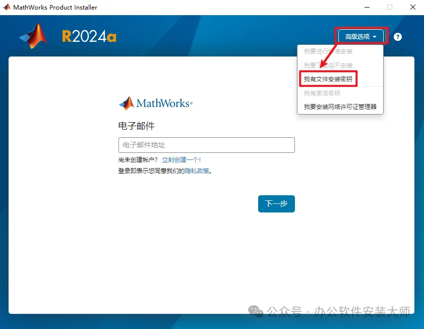4.点击弹窗右上角的【高级选项】,选择【我有文件安装密钥】。