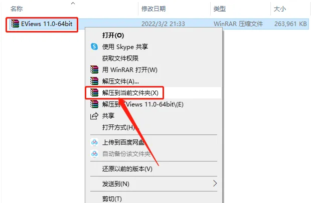 1.打开下载的EViews软件安装包,鼠标右击压缩包选择【解压到当前文件夹】。