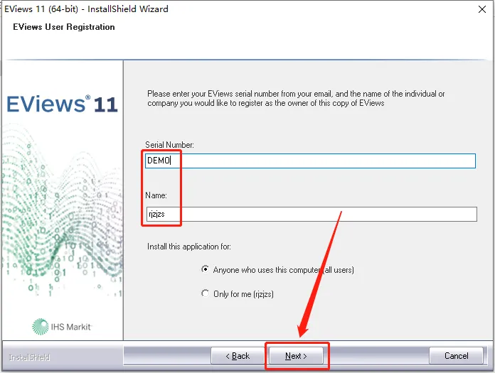 11.以一个选项框中输入DEMO,第二个选项框中输入rjzjzs,然后点击【Next】。