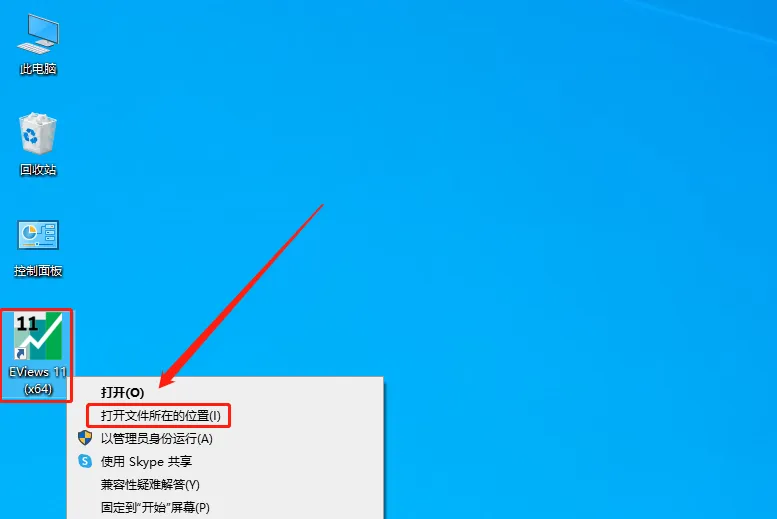 21.在桌面上找到EViews软件图标,鼠标右击选择【打开文件所在的位置】。